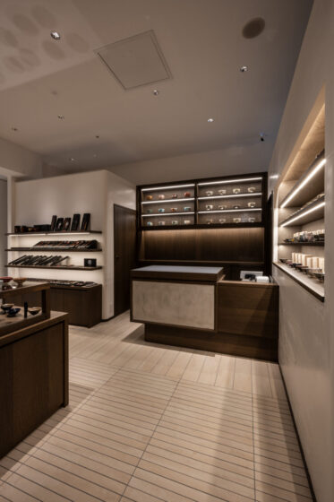 景色を切り取るようダークトーンでまとめた空間は、御客にゆったりとした時間を過ごしていただけるよう、肌触りのより質感のマテリアルで構成している。